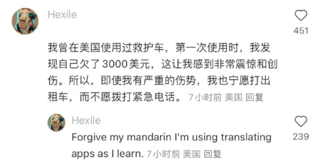 一名美國網友因為叫了一次救護車,就花了3000美元,從此發誓,只要還能動,就不叫救護車,寧願打出租車。