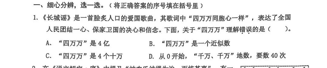 一般試卷前面大多是基礎題,循序漸進,可這份考卷零幀起手,開頭就是博古通今,又是長城謠、又是愛國情懷,最後考的是“四萬萬”。