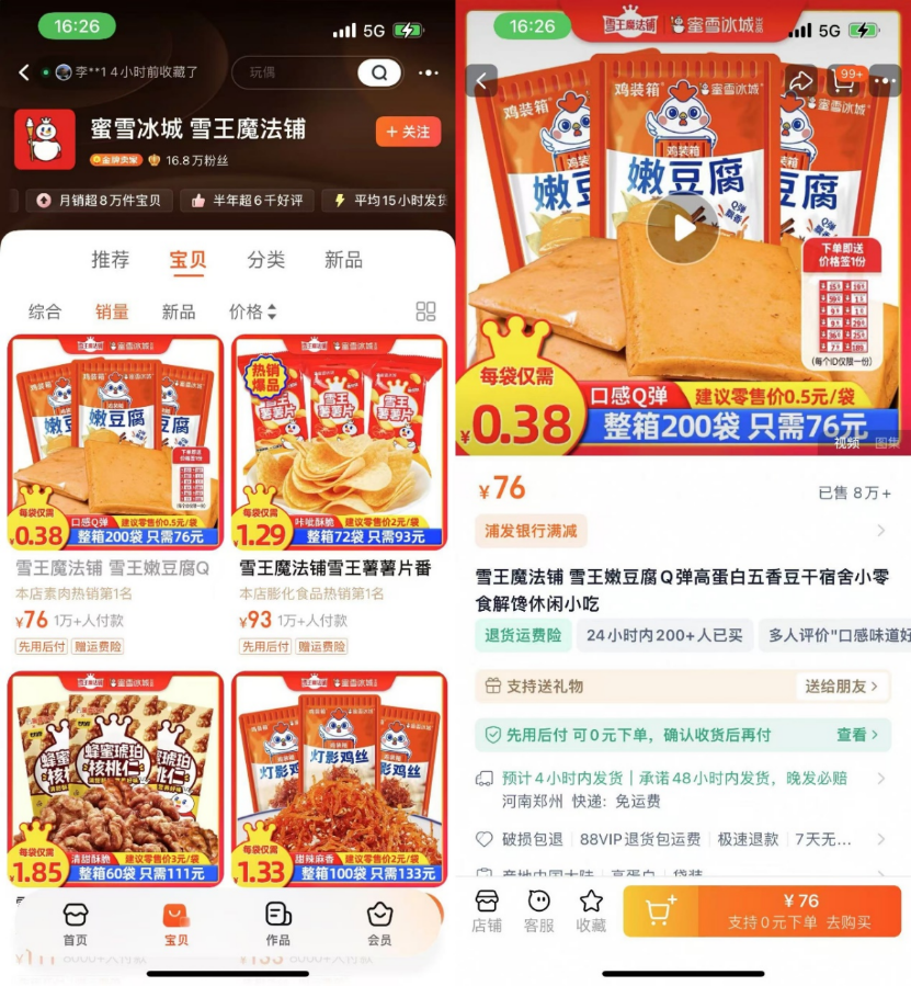 此外,雪王還在淘寶開設了“雪王魔法鋪”,銷售茶系列、口袋零食系列、咖啡系列、杯子系列、文創周邊系列等系列產品,目前該店銷量最高的嫩豆腐乾,已售出8萬+份。