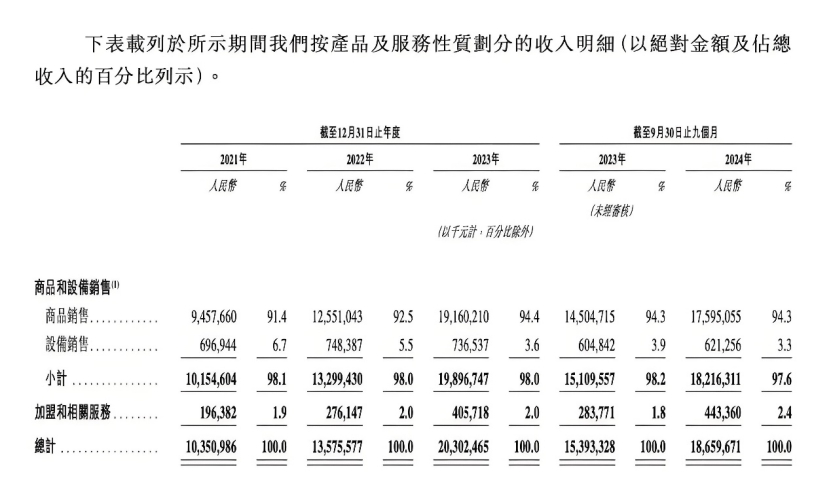 2024年前9個月,蜜雪冰城的加盟和相關服務收入為4.4億元,僅佔總營收的2.4%;向加盟商銷售設備的收入約為6.2億元,佔總收入的3.3%,約95%的公司收入,其實是來自向加盟商銷售物料(包含糖、奶、茶、咖、果、小料等材料),收入約為176億元。