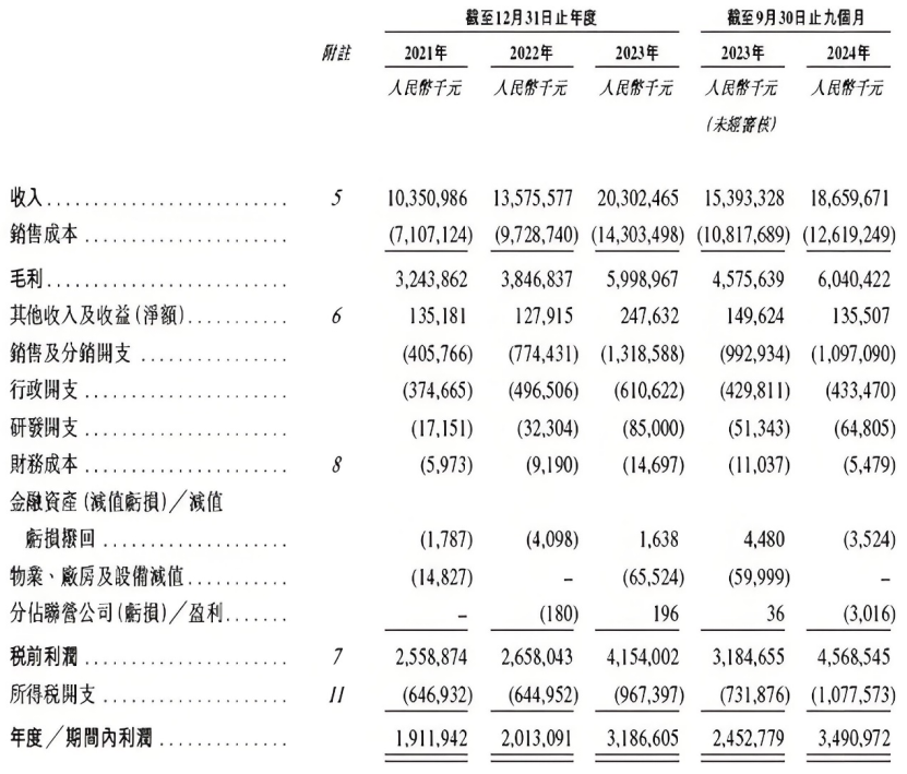 2022年-2024年前三季度,蜜雪冰城的淨利潤分別為20億元、32億元、35億元,分別同比增長5.3%、58.3%、42.3%,2023-2024年前三季度,其淨利潤同比增速均明顯高於營收增速,盈利能力顯著提升。