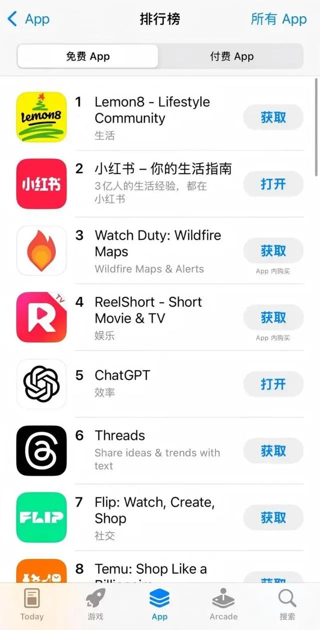 下載榜排名第一的Lemon8,第二的小紅書,第四的ReelShort、第八的Temu。分別來自字節跳動、小紅書、中文在線集團還有拼多多。
