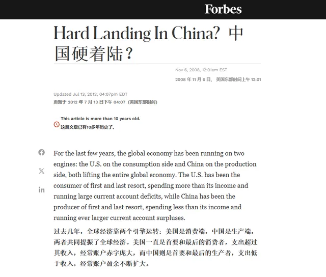 2008年,美國《福布斯》雜誌:《中國經濟要硬着陸了嗎?》(Hard Landing In China?)