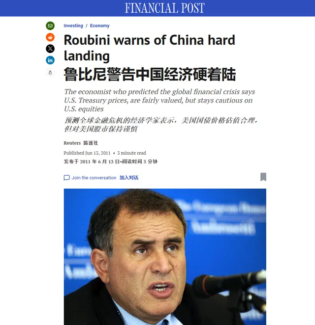 2011年,英國路透社:《西方經濟學家魯比尼警告稱,中國經濟面臨硬着陸風險》(Roubini warns of China hard landing)