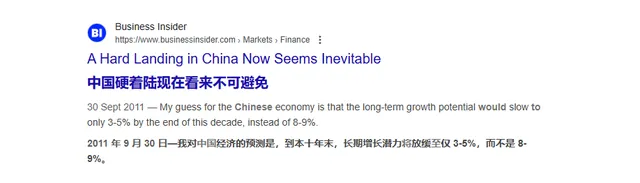 2011年,美國“商業內幕”網:《為什麼中國經濟迎來硬着陸的那一天可能要比你想象得更近?》(Why a Chinese Hard Landing May Be Closer Than You Think)《現在看來,中國的經濟硬着陸已經不可避免了》(A Hard Landing in China Now Seems Inevitable)