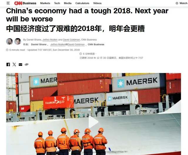 2018年12月30日,CNN:《中國經濟度過了艱難的2018年,但是明年的形勢將會更糟》(China’s economy had a tough 2018. Next year will be worse)