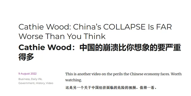 2022年,美國投資人凱西·伍德:《中國的崩潰比你想象的要嚴重得多》(China’s COLLAPSE Is FAR Worse Than You Think)
