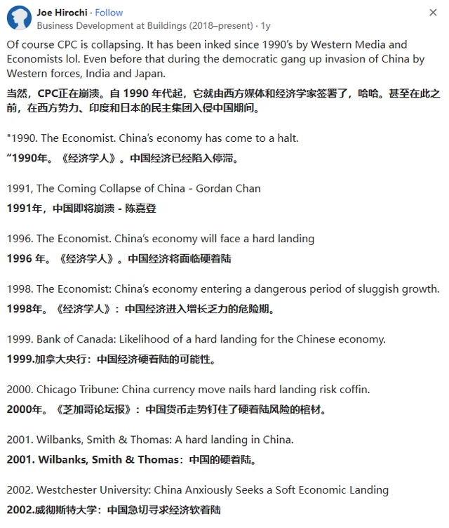 Hirochi)的Quora答主,他的回答和別人的都不一樣,他是直接把自1990年以來的部分西方媒體和專家學者唱衰中國經濟的有關評論與文章作了一個粗略的統計彙總,也就是我們如今常説的“合訂本”。