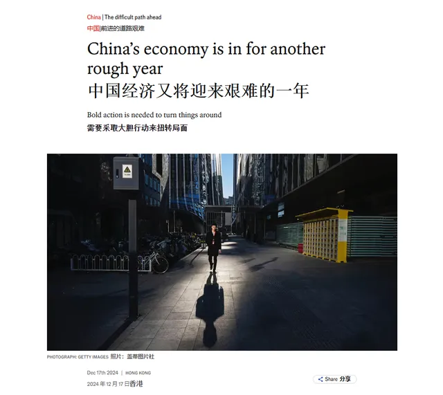 2024年12月17日,《經濟學人》:《中國經濟又將迎來艱難的一年》(China’s economy is in for another rough year)