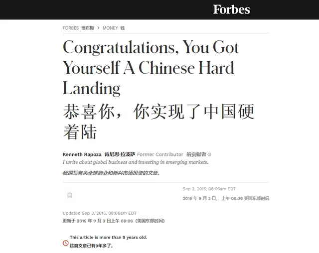 2015年,《福布斯》:《恭喜你中國,你成功實現了經濟硬着陸》(Congratulations, You Got Yourself A Chinese Hard Landing)