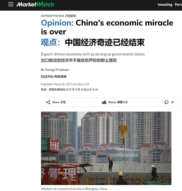 2017年,“市場觀察”網:《中國的經濟奇蹟已經結束咧》(Opinion: China’s economic miracle is over)