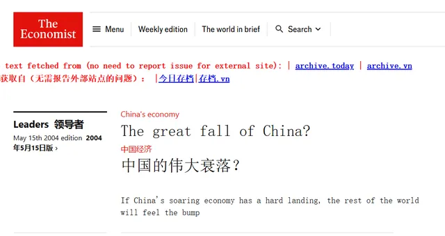 2004年,《經濟學人》:《中國即將迎來經濟大衰退?》(The great fall of China?)