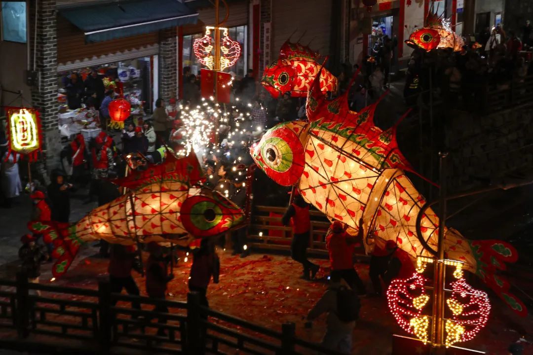 年年有“魚”走進現實是啥樣?近日,安徽歙縣瞻淇村上演了非遺民俗“舞魚燈”活動。夜幕下,一盞盞魚燈遊走在街頭巷尾,明亮的燈火點亮街頭,遊進山村田野。