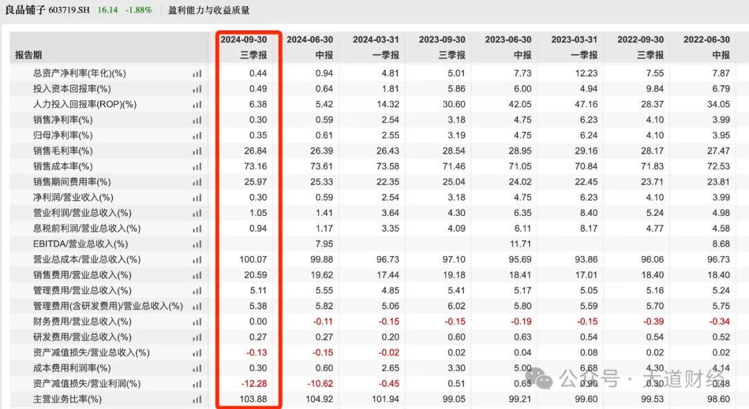如果把數據拉近到2023年和2024年,大道財經發現,2024年三季度,公司的投入資本回報率、銷售淨利率、歸母淨利率、資產減值損失等數據在2024年中報的基礎上繼續變差,其中淨利潤與營業收入的比例相比中報又下降了近50%(見圖4)。