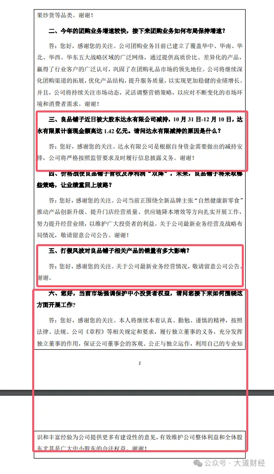 關於達永有限公司減持的原因,良品鋪子在2024年12月13日的投資者關係活動記錄表中表示,達永有限公司是根據自身資金需要做出的減持安排,公司將嚴格按照監管要求及時履行信息披露義務。
