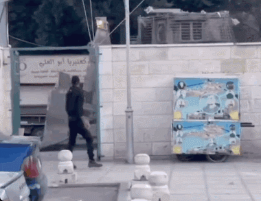 ▲以色列推土機將汽車殘骸堆積在路上,堵塞馬路