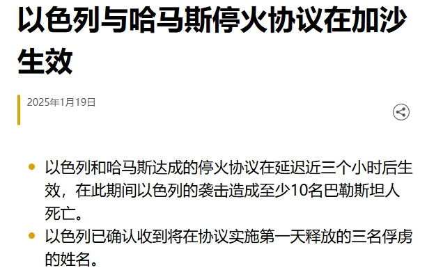 在多國擔保下,按照簽訂的協議,以色列與哈馬斯加沙地帶停火協議將會在今天1月19日生效。在過去十五個月的衝突中,巴勒斯坦的加沙地帶經歷了數不清的轟炸、封鎖、巷戰,造成數以萬計無辜平民和聯合國人員死亡。