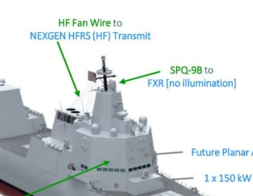 此外,DDGX還會安裝一套雙波段雷達,在桅杆頂部安裝有一部單面陣AN/SPQ-9B型X波段快反雷達,足以擔負近方雷達的職能。只是不清楚為何它的快反雷達還是使用了單面旋轉陣,且從目前DDGX的概念設計圖上看,DDGX似乎並沒有比較強的綜合射頻設計。