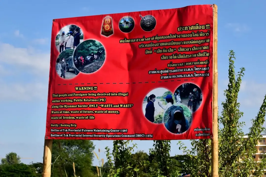 ◆2023年,泰緬邊境附近,一塊宣傳板警告潛在受害者不要“被欺騙從事電信網絡詐騙”。