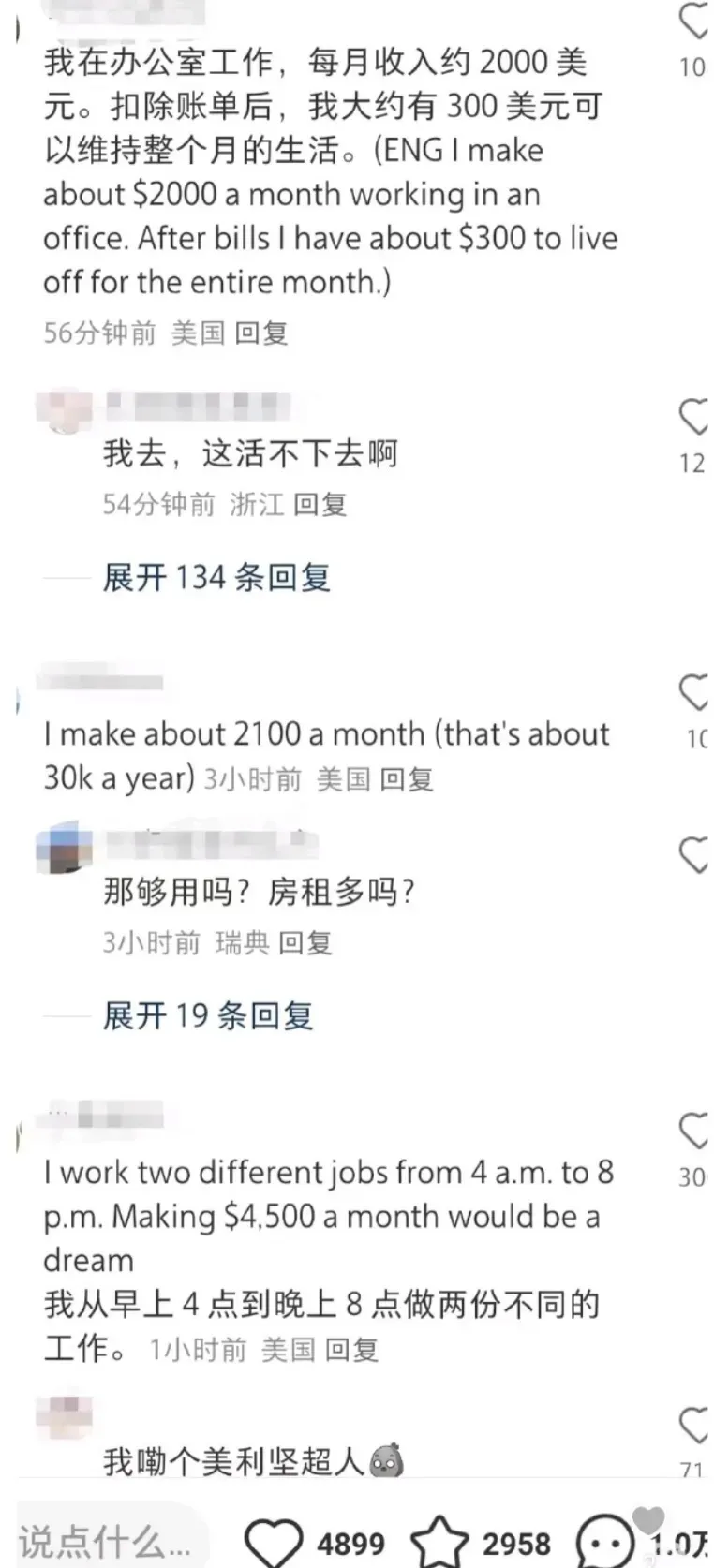 而且,普通美國民眾的收入也沒有殖人公知説的那麼高,除去日常開支,幾乎所剩無幾。那種洗碗拿高薪的言論就很傻X,美國網友問哪有這樣的活,他們立刻去。