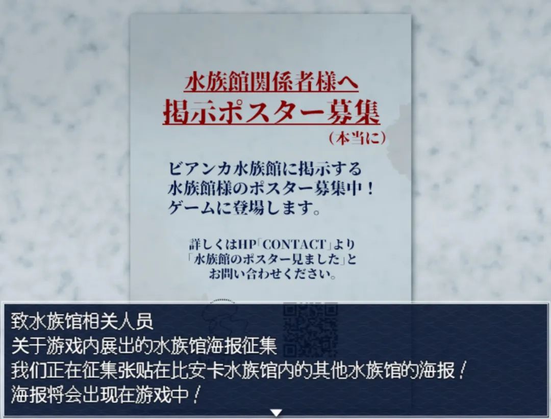 橙々在她所描繪的遊戲世界裏,構建了一座位於她老家的水族館,你能從場景的交互與角色對話中感受到作者對水族館的實地考察之細緻;當遊戲場景轉向陰森恐怖的異世界之後,橙々對恐怖氛圍的把控也確實能體現出她對“恐怖”二字的深刻理解,不會嚇得人舉步維艱,也不至於讓你玩得昏昏欲睡。