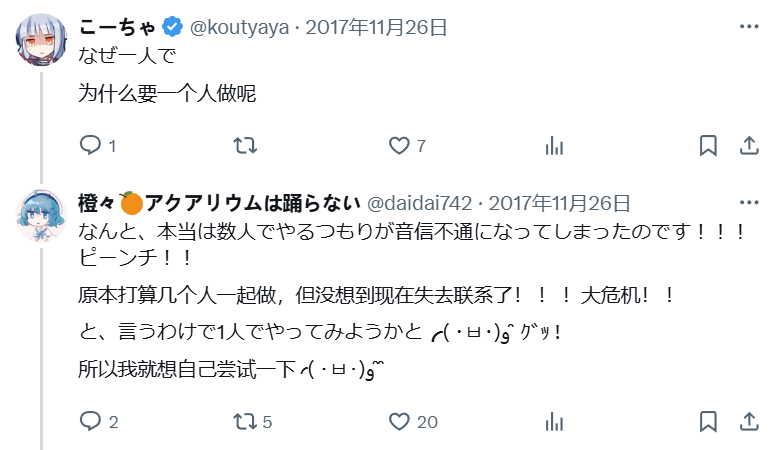 在《水族館不會跳舞》的企劃剛剛起步的時候,遊戲開發團隊原本有5名成員。後來,橙々身邊的戰友一個接一個地消失,還沒等她回過神來,5人的遊戲開發聊天羣裏只剩橙々獨自留守。而這之後的故事,正如上文提到的那樣,橙々堅持完成了遊戲開發,並在各種機緣巧合之下意外爆火,獲得了前所未有的好成績。