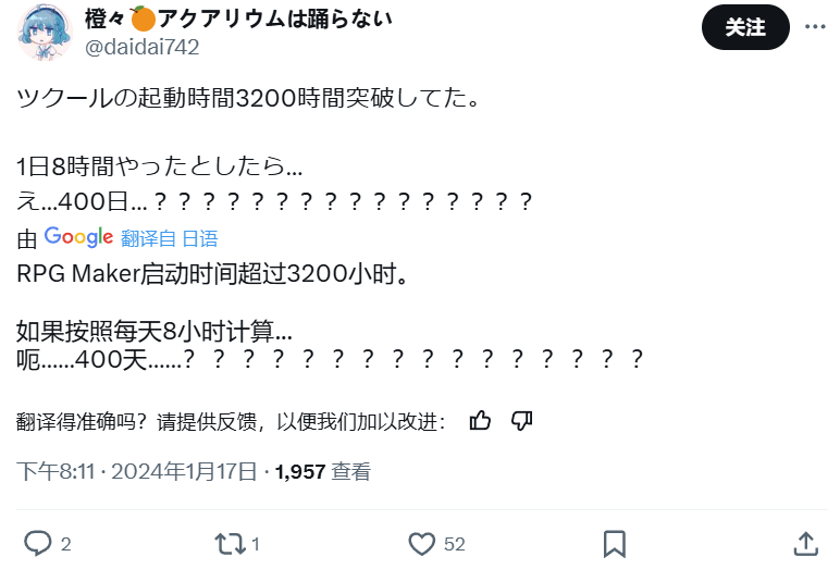 橙々對RPG Maker的瞭解不多,她擅長的是畫畫而不是做遊戲。從零開始學習遊戲製作,似乎是橙々無法避開的抉擇。2017年12月,橙々在推特上彙報自己購買了正版RPG Maker,等到2024年年初,她的軟件啓動時間就已經突破了3200小時。
