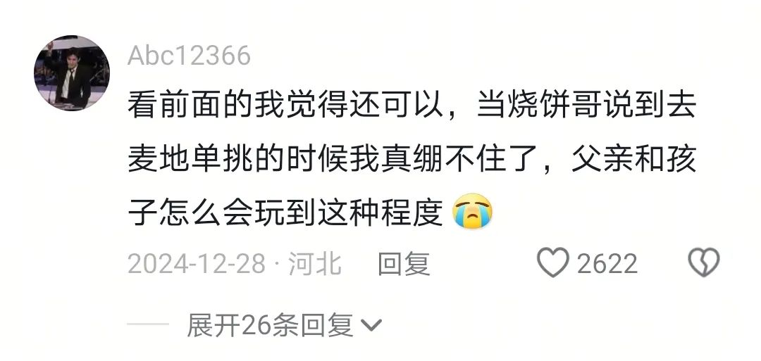 可以説,這樣的親子互動,是燒餅哥獨特的教育手段、是他成為百萬大號的流量密碼。而燒餅哥父子作品的魅力,則是其中隱藏着無數觀眾殘缺的童年碎片。