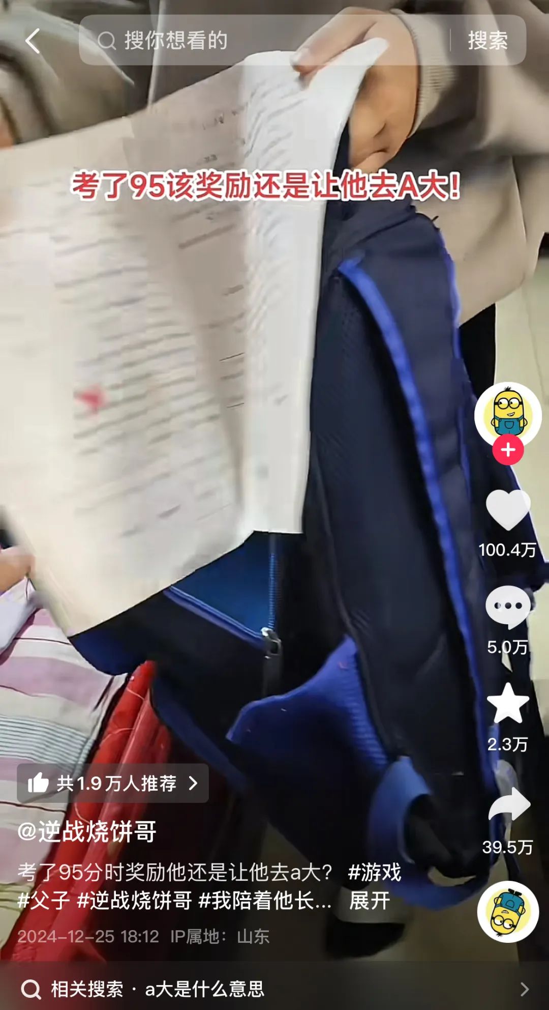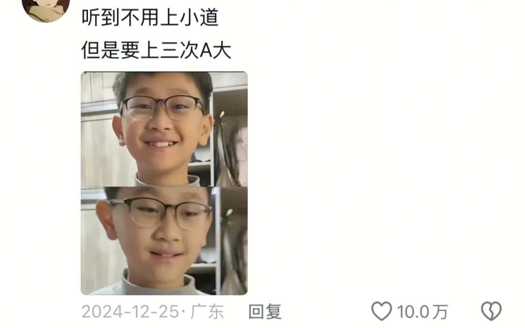 對此,燒餅哥對孩子的解釋是,“你上個屁北大,你這個分數只能跟我上A大”。