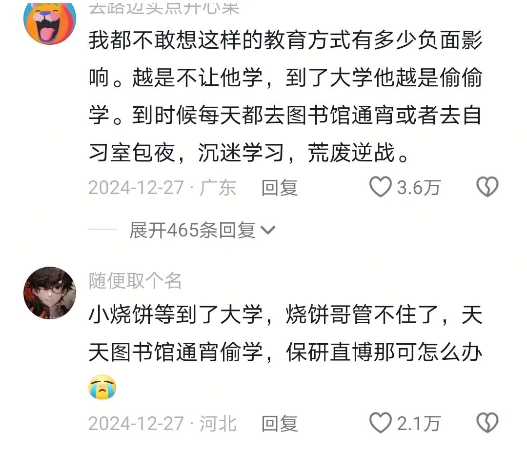 而在日常直播時,當兒子終於承受不住,哭着説出“不想玩了,我想去寫作業”時,燒餅哥則會抓緊時機,語重心長地教育兒子:“你寫什麼作業?你作業都寫完了,一會跟着我上小道!”