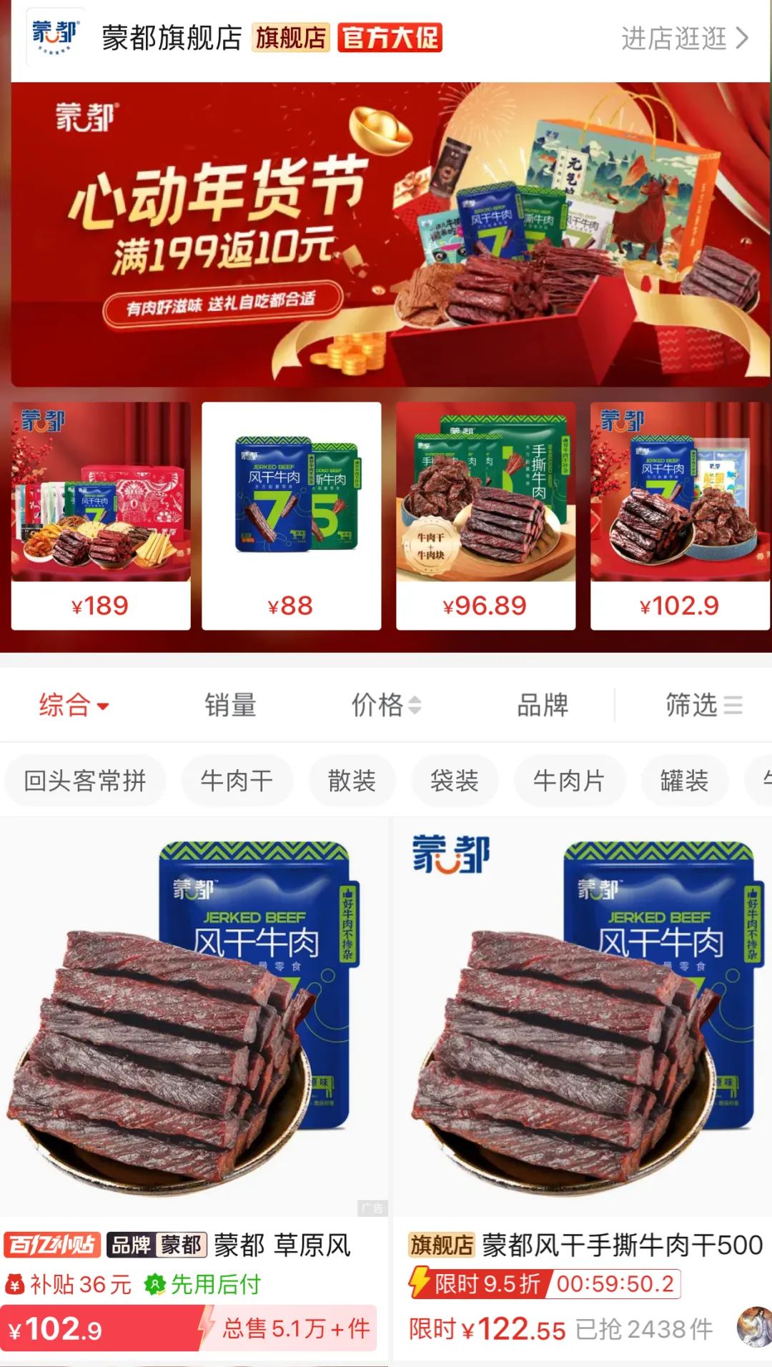 去年,蒙都為拼多多店鋪配備了專門的運營人員,當年5月,蒙都500g不同形狀的牛肉乾混合裝入選“百億補貼”,獲得了海量流量扶持,一炮而紅,成為爆款。