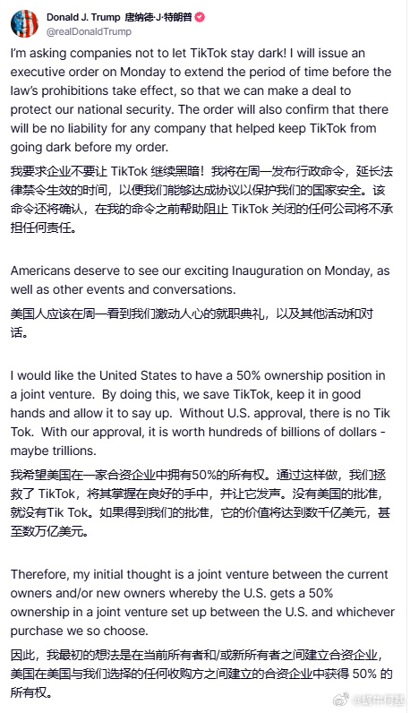 此前特朗普表示美國要求在tiktok的合資企業中擁有50%的所有權,通過這樣拯救 TikTok,將其掌握在美國的手中。