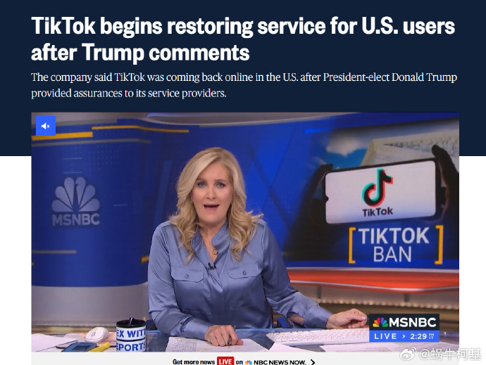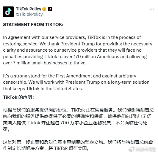 TikTok在 X 上發帖稱:“根據與我們服務提供商的協議,TikTok 正在恢復服務。” “我們感謝特朗普總統向我們的服務提供商提供了必要的明確性和保證,確保他們向超過 1.7 億美國人提供 TikTok 並讓超過 700 萬家小企業蓬勃發展,不會面臨任何處罰。”
