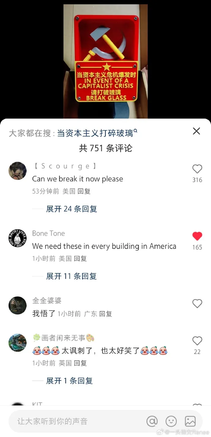比如,“美國政府啊,爹味兒別那麼重了,放手讓我們用我們的中國APP吧,讓我們在我們的中國手機上,穿着我們的中國衣服,躺在我們的中國牀上。快點讓我們用我們的中國APP,啊啊啊啊啊!!!!不然我就要喊田文鏡啦!!!!”