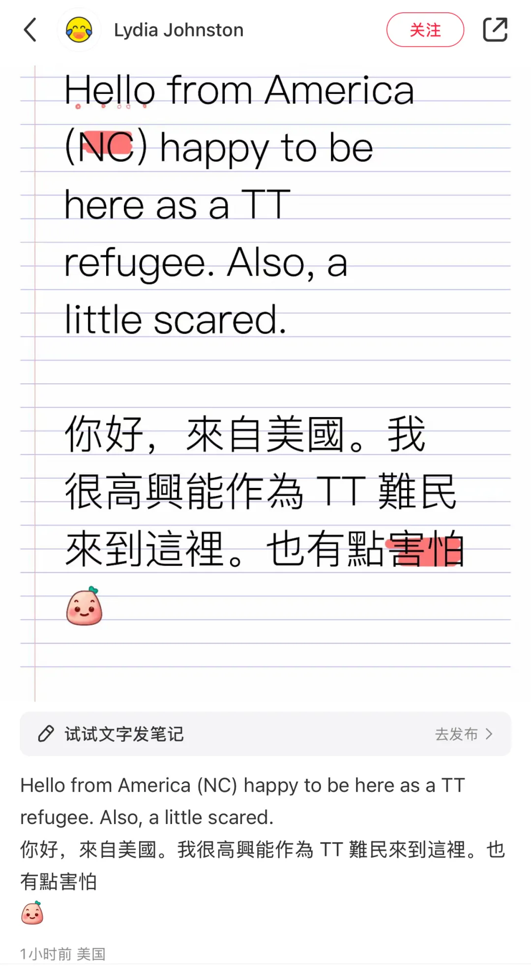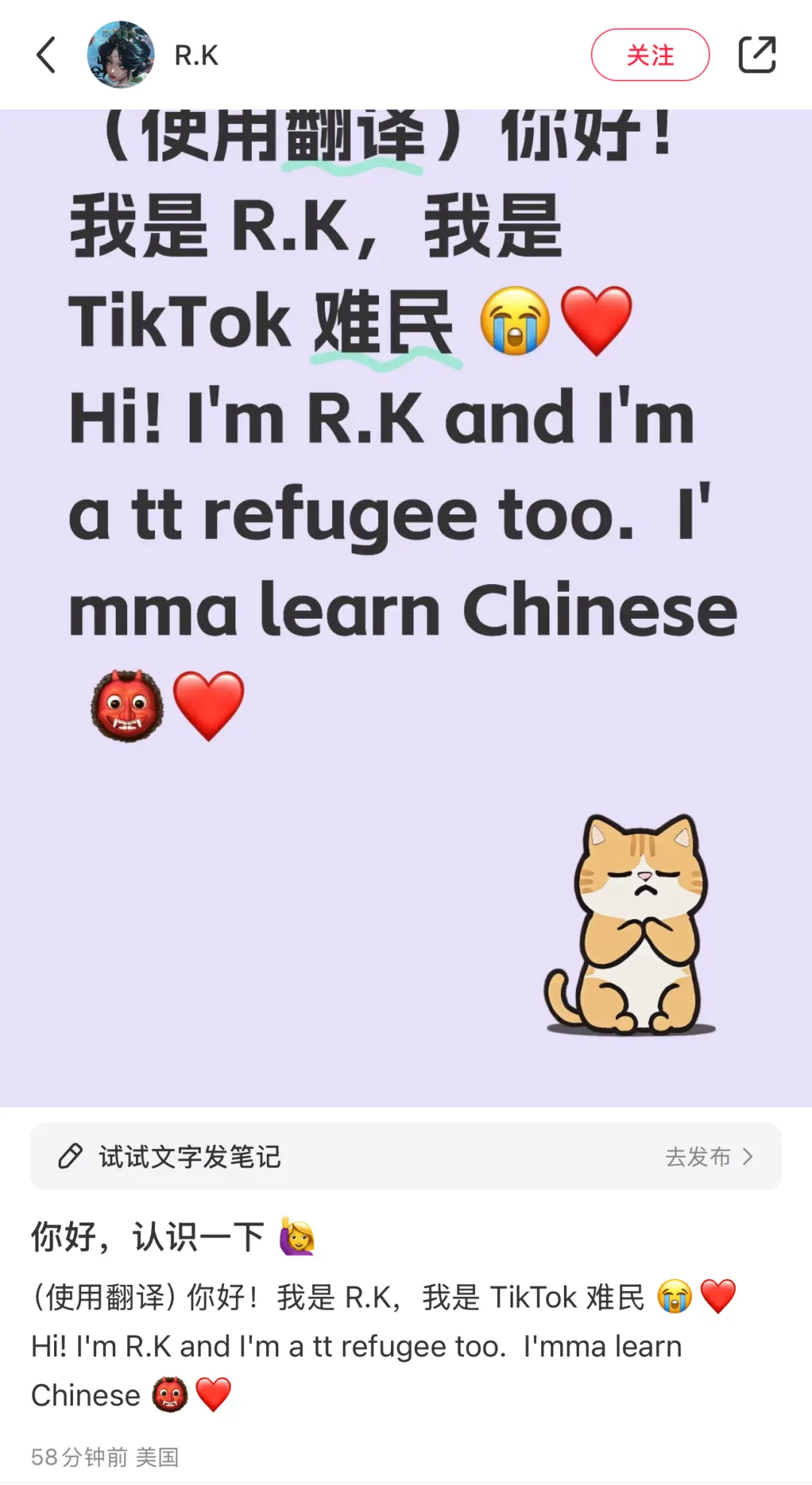 “你們好,我是XX,我是一個TikTok難民,我現在在用谷歌翻譯和你們聊天,我正在學中文。”