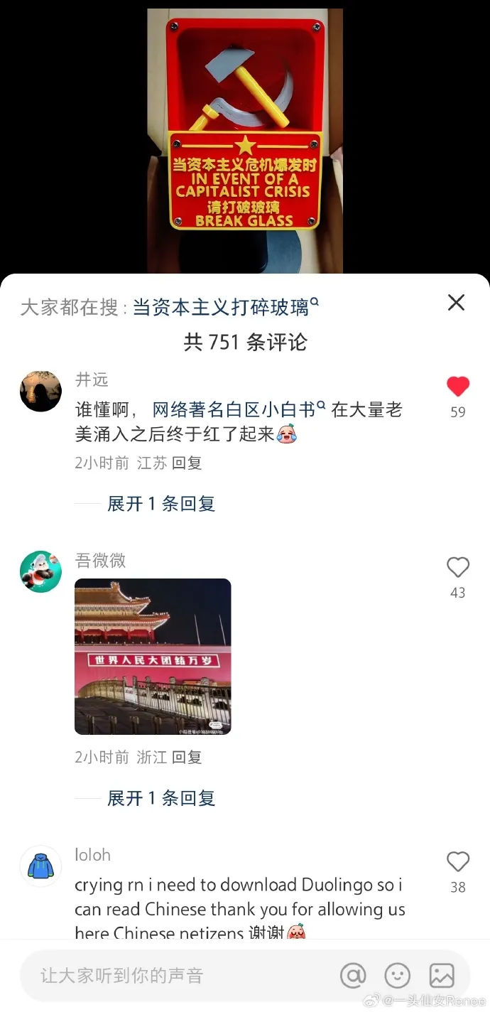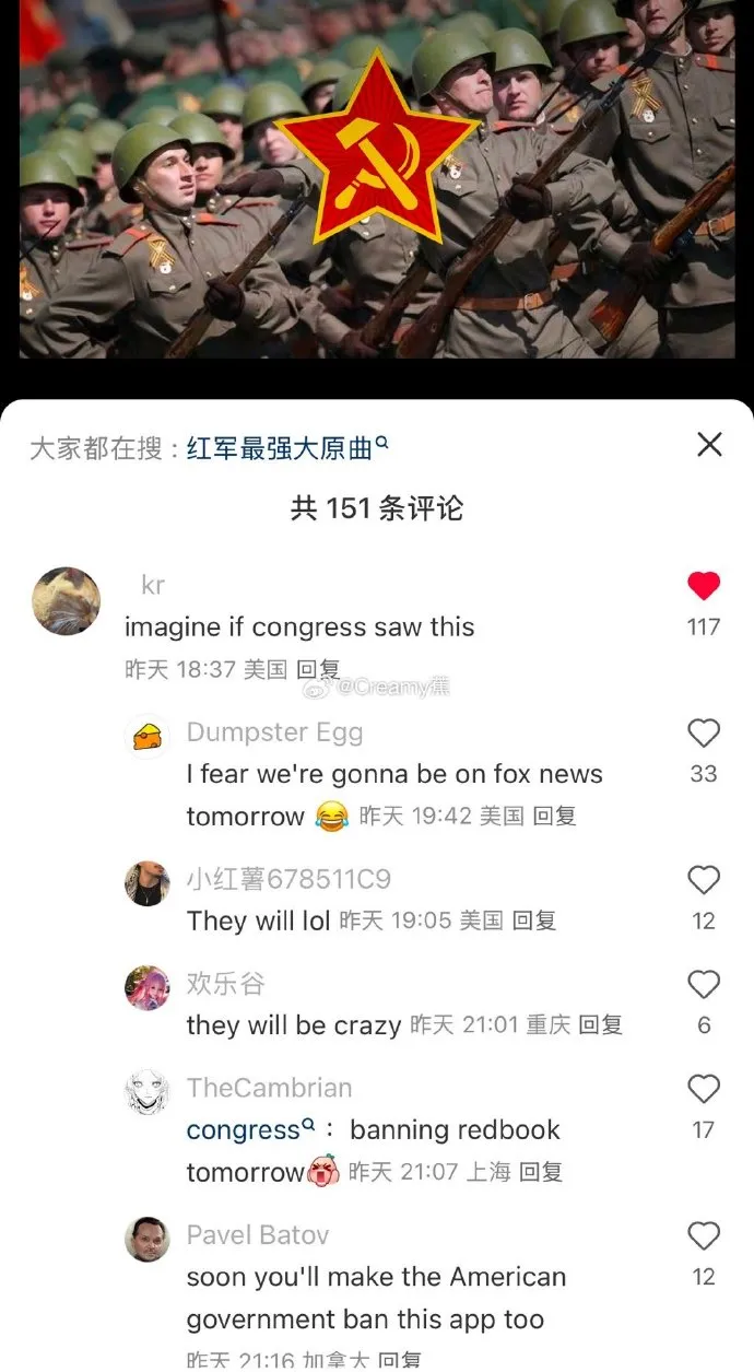 又比如,有人在小地瓜上刷到了蘇聯紅歌《紅軍最強大》和“親愛的達瓦里希,國際共產主義運動萬歲”等內容,整個人一下就上頭了。有呼籲共產主義快來解放美國的,有揶揄美國政府“我都不敢想要是讓我們國會知道我在看這個他們會不會瘋”的,還有感慨“紅色理想的星星之火原來還在我們心中的燃燒”的。
