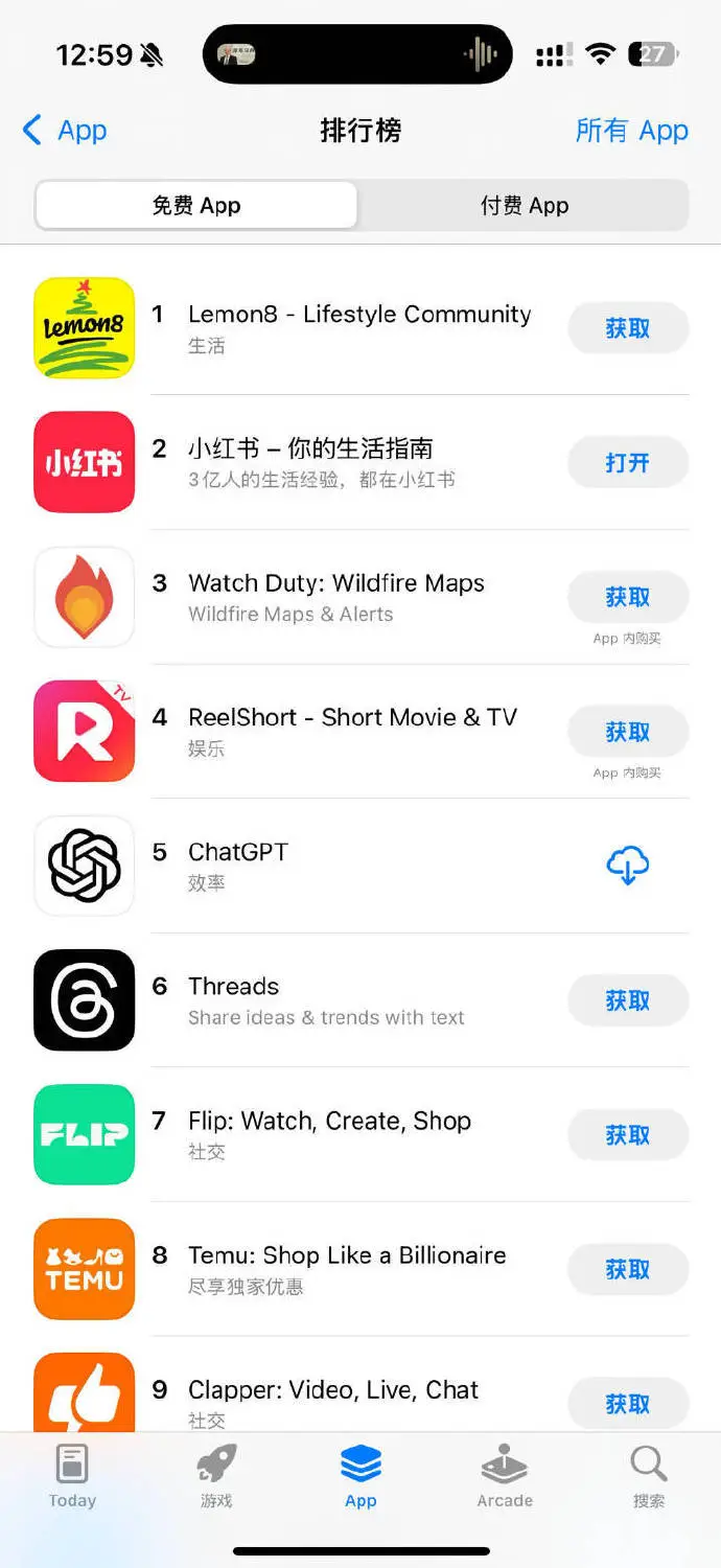 受此影響,大量中國APP在近期被美國網民送來的潑天流量給硬生生推到了美區應用商店的熱搜前幾名,其中熱度最高的就是小地瓜,然後就是同屬字節跳動旗下的生活社區應用Lemon8和涮短劇專用應用Reelshort等。排名前5的APP只有倆是美國公司的,一個ChatGPT,還有一個是追蹤野火的專用應用Wildfire Maps。