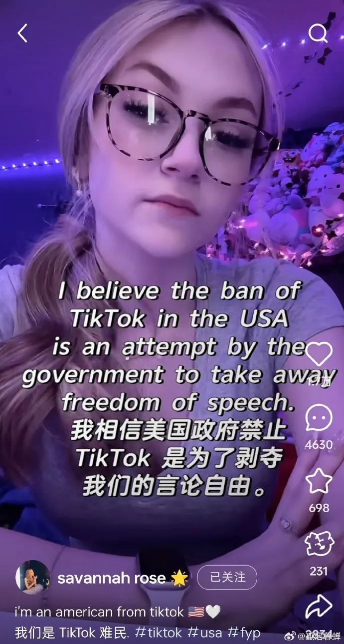 比如,“因為我的TikTok被美國政府封了,所以我決定潤去中國,這樣我就只能繼續使用我親愛的中國的手機APP了。”