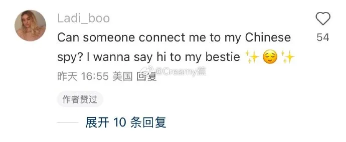 “家人們,請問你們哪位寶子能好心幫我聯繫一下我的‘中國間諜’嗎?我只想和他説一句‘嗨’,向他送上我最誠摯的問候。”