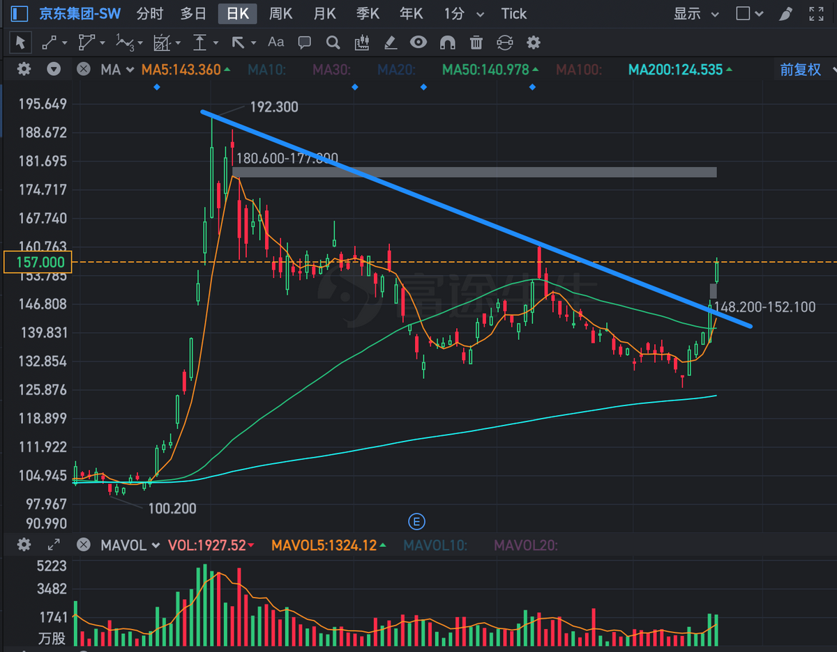 美團在回踩200日均線之後,迎來了強勢反彈,最近五個交易日連續反彈。美團數據顯示,截至1月16日,美團上“年夜飯預訂”“年夜飯餐廳推薦”相關搜索量月環比提升256%,年夜飯線上預訂量同比增長305%。另外,花旗對美團快速滲透步伐看法正面,並預料公司今年市場份額增長顯著。該行重申對美團“買入”評級,目標價為203港元。