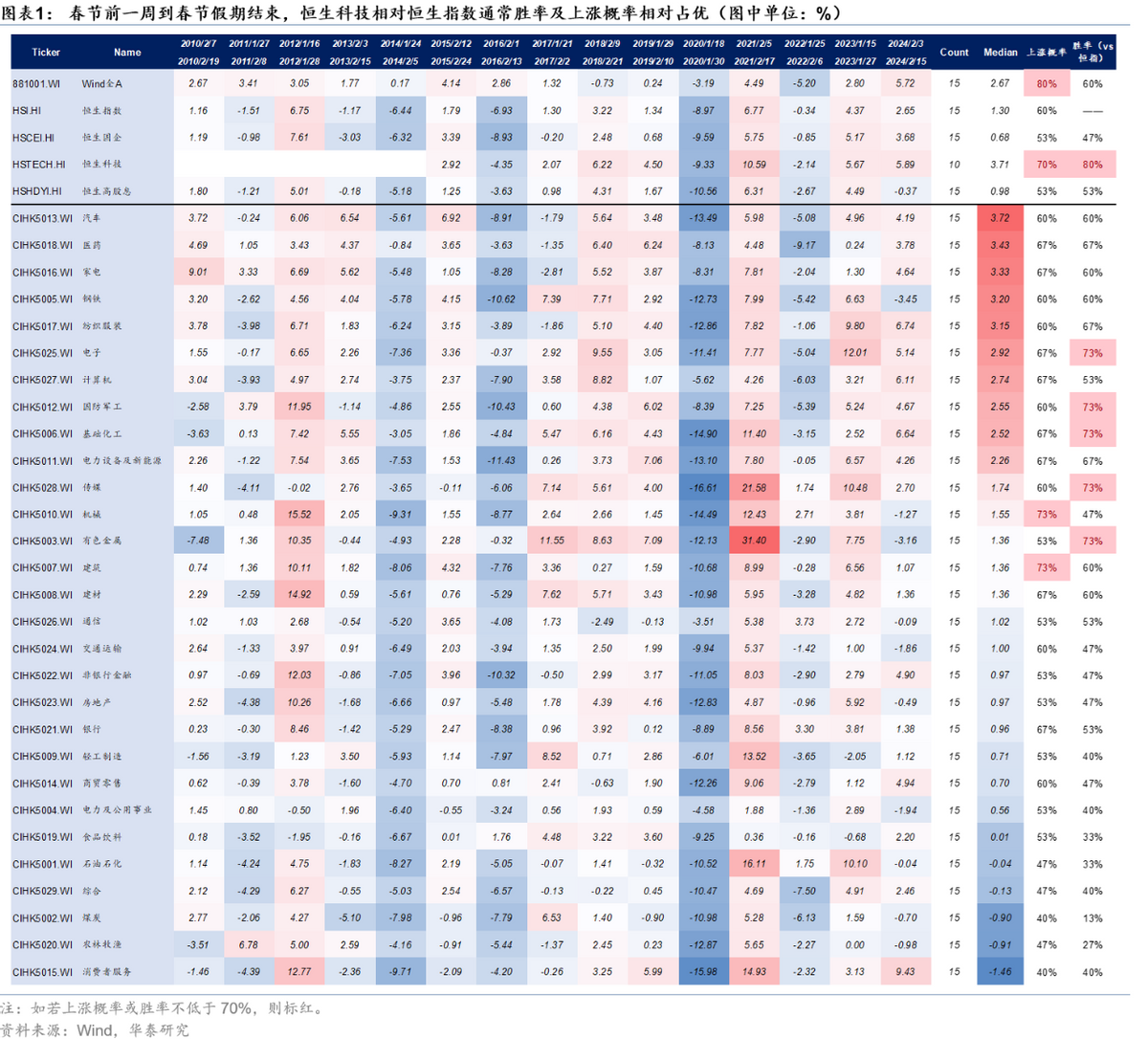 除了中金公司看好港股市場,臨近春節,投資者開始關注中國資產的春季行情機會。覆盤2010-2024年數據,春節前一週A股與港股或已開啓春季行情,節前一週至春節假期結束,Wind全A與恒指上漲概率分別為80%與60%。