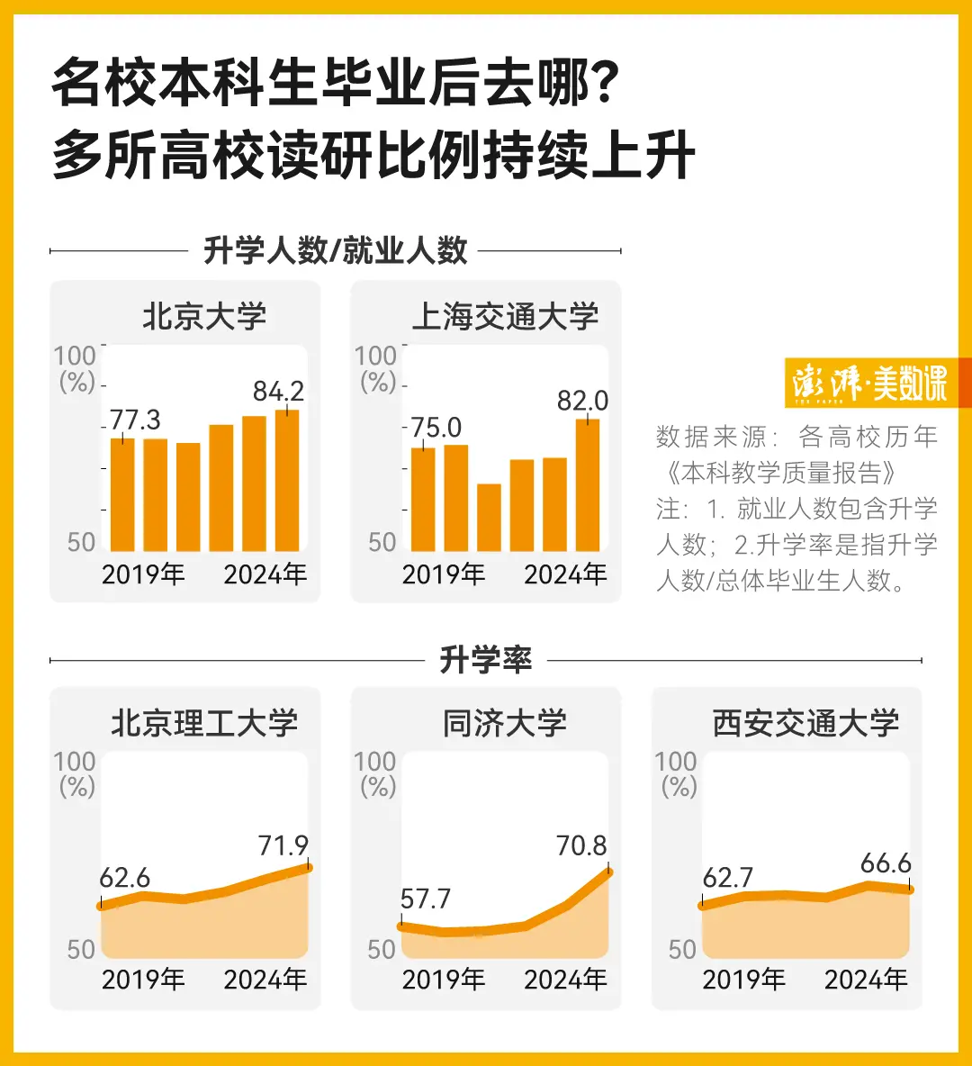 一些名校還公佈了升學率,即總體畢業生中的升學佔比,該數值也在逐年提高。其中,北京理工大學的升學率從2019年的62.6%漲至2024年的71.9%,也就是2024年中100名畢業生中,有71.9%選擇了升學。同濟大學、西安交通大學都有相同情況。
