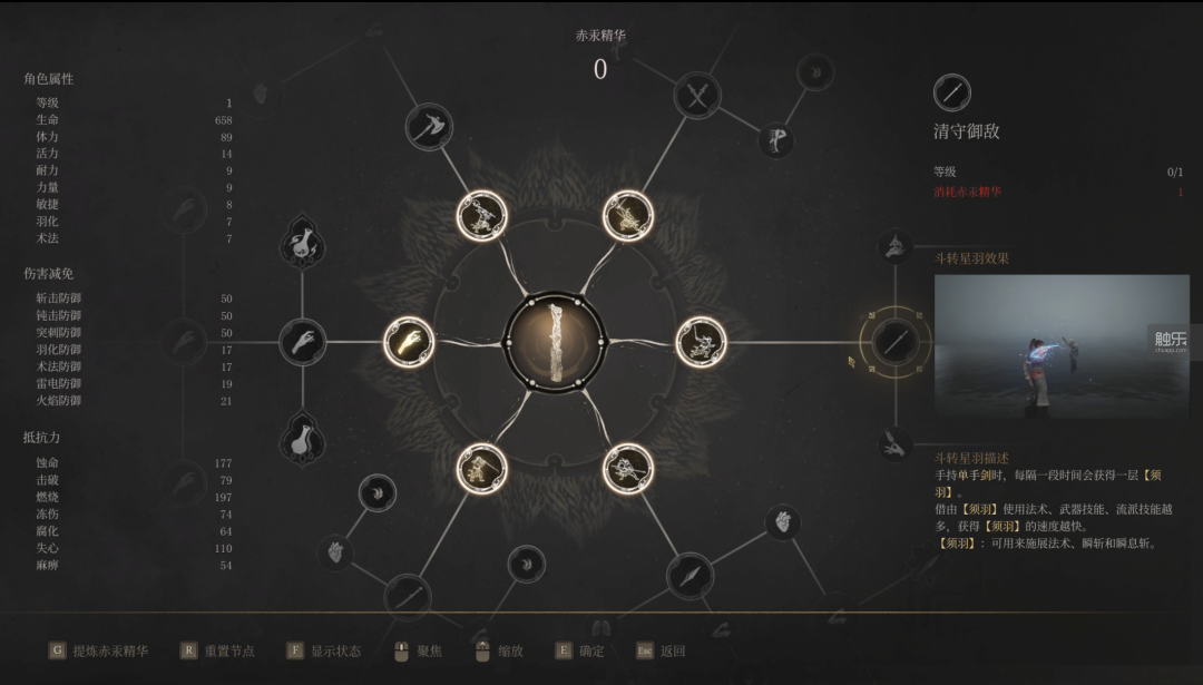 但另一方面,伴隨流程的推進和角色的成長,玩家能夠以較為合理的節奏獲得更多進攻和反制手段,提升角色性能。比如,通過戰勝敵人收集赤汞精華,點亮技能樹中不同的分支,解鎖新的技能和戰鬥機制;通過探索推進遊戲流程,獲取帶有新機制的強大武器和法術能力。