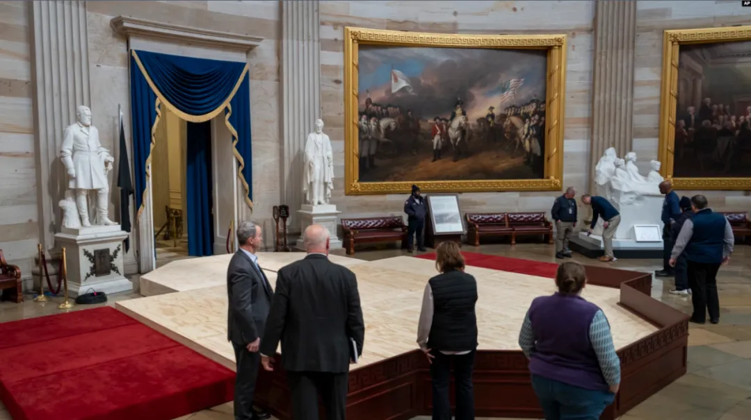 在華盛頓的國會大廈,工作人員檢查圓形大廳內正在搭建的講台,當選總統特朗普預計將在這宣誓就職。(圖源:美聯社)