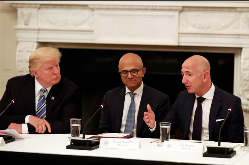 扎克伯格和貝索斯則屬於眼看特朗普要贏,趕緊等上船的人,兩人在12月份先後宣佈給特朗普就職基金捐款100萬美元,實際上就是為了買那張最高級別的門票。