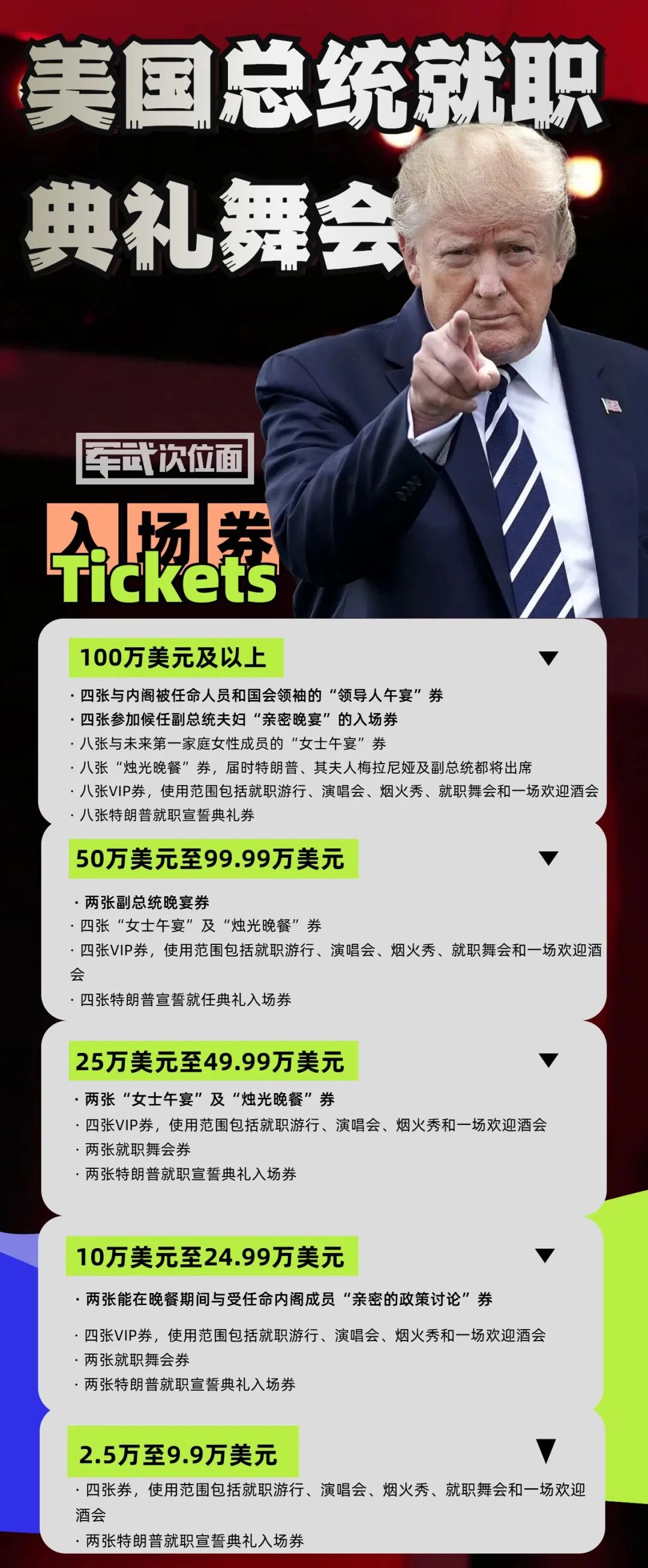 最低捐2.5萬美元的,只能參加最基礎的就職舞會和特朗普宣誓典禮,相當於遠遠的看一眼特朗普,重在參與。
