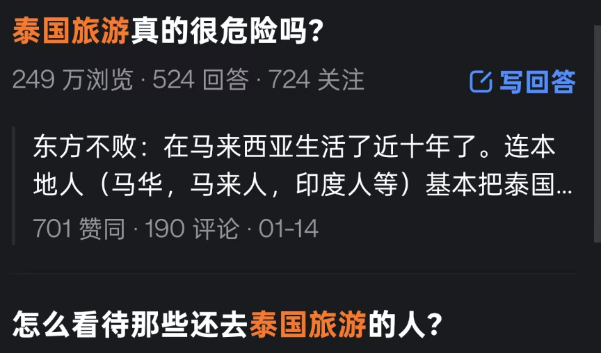 不過,只要打開中國任何一個社交媒體,“泰國”幾乎成為了輿論中心:小紅書“泰國還能去嗎”話題下有超過4942萬篇筆記,知乎上《泰國旅遊真的很危險嗎》有超過249萬的關注。