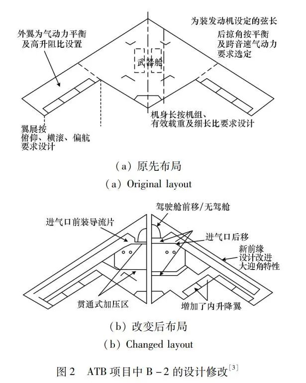 這一點,也可以從B-2戰略轟炸機的設計進化路線看出。B-2從最早的單W大菱形結構改為雙W型結構、前緣後掠角從35°改為33°、從單純的外翼端操縱面設計到外翼端,內翼端均有升降副翼舵面、駕駛艙有所前移,進氣口順勢後移,載荷分配/貫通的合式結構簡化了載荷的傳遞方式,中段翼箱的設計更加合理等。通過以上這些調整,可以讓B-2儘可能地免受先天劣勢的不利影響,同時使其飛行品質也趨於良好。