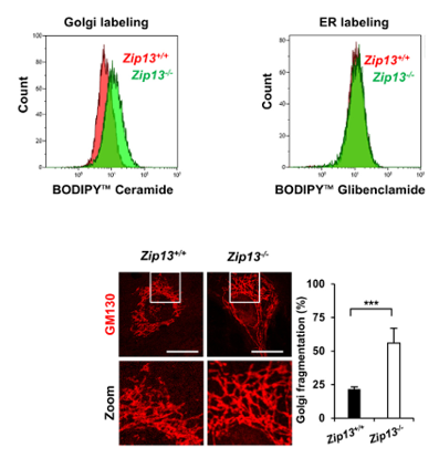 鋅缺乏會損害高爾基體的功能,那如果直接敲除高爾基體中的鋅轉運蛋白ZIP13,細胞又會發生何等變化?科學家們在敲除ZIP13後發現,與之前衰老細胞表現出的“應激”狀況一樣,高爾基體不僅功能異常,結構更是碎了一地……