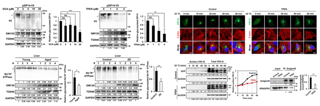 通過觀察鋅缺乏的小鼠,科學家們發現其體內的其他重要轉運蛋白(例如ZIP14和Na+/K+泵)的糖基化程度減少,繼而導致與高爾基體壓力相關基因(Arf4和Uap1/1)表達的顯著上調,推動蛋白質運輸受阻,出現功能紊亂。